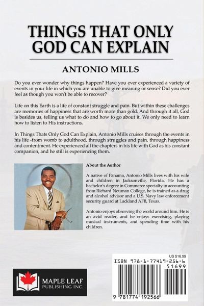 Do you ever wonder why things happen? Have you ever experienced a variety of events in your life in which you are unable to give meaning or sense? Did you ever feel as though you won't be able to recover? Life on this Earth is a life of constant struggle and pain. But within these challenges are memories of happiness that are worth more than gold. And through it all, God is besides us, telling us what to do and how to go about it. We only need to learn how to listen to His instructions. In Things Thats Only God Can Explain, Antonio Mills cruises through the events in his life from womb to adulthood, through struggles and pain, through happiness and contentment. He experienced all the chapters in his life with God as his constant companion, and he still is experiencing them.