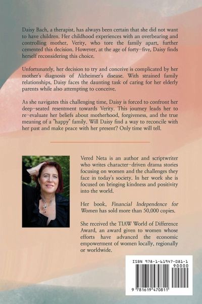 Daisy Bach, a therapist, has always been certain that she did not want to have children. Her childhood experiences with an overbearing and controlling mother, Verity, who tore the family apart, further cemented this decision. However, at the age of forty-five, Daisy finds herself reconsidering this choice. Unfortunately, her decision to try and conceive is complicated by her mother's diagnosis of Alzheimer's disease. With strained family relationships, Daisy faces the daunting task of caring for her elderly parents while also attempting to conceive. As she navigates this challenging time, Daisy is forced to confront her deep-seated resentment towards Verity. This journey leads her to re-evaluate her beliefs about motherhood, forgiveness, and the true meaning of a "happy" family. Will Daisy find a way to reconcile with her past and make peace with her present? Only time will tell.
