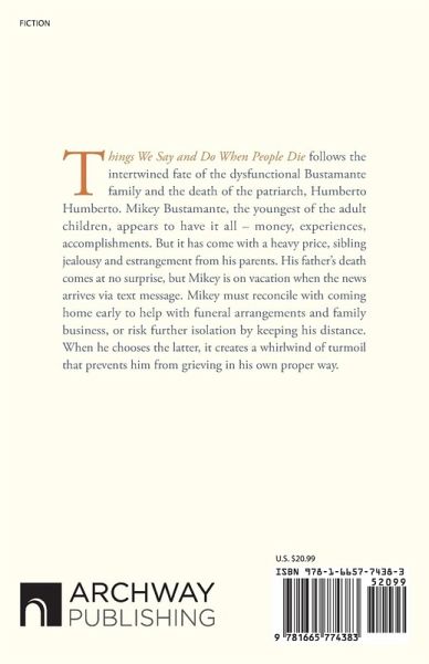 Things We Say and Do When People Die follows the intertwined fate of the dysfunctional Bustamante family and the death of the patriarch, Humberto Humberto. Mikey Bustamante, the youngest of the adult children, appears to have it all - money, experiences, accomplishments. But it has come with a heavy price, sibling jealousy and estrangement from his parents. His father's death comes at no surprise, but Mikey is on vacation when the news arrives via text message. Mikey must reconcile with coming home early to help with funeral arrangements and family business, or risk further isolation by…mehr