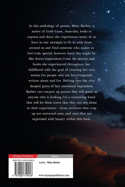 In this anthology of poems, Misty Barber, a native of Gold Coast, Australia, looks to express and share the experiences many of us have in our attempts to fit in with those around us and find someone who makes us feel truly special, however hard this might be. She draws inspirations from the movies and books she experienced throughout her childhood with the goal of creating her own stories for people who are less frequently written about and for. Delving into the very deepest parts of her emotional expression, Barber can conjure up poems that will speak to anyone who is looking for a reassuring hand that will let them know that they are not alone in their experiences - those anxieties that crop up are universal ones, and ones that are expressed with beauty within this book.