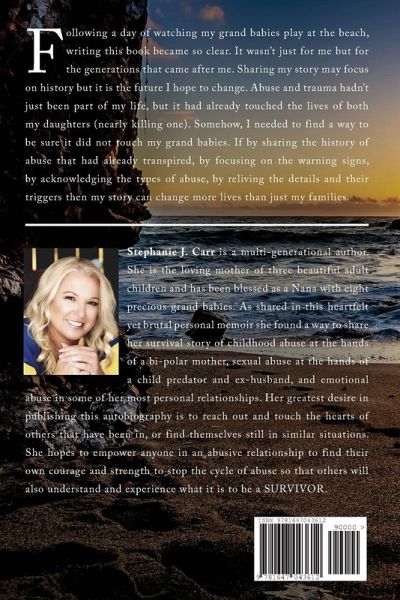 Following a day of watching my grand babies play at the beach, writing this book became so clear. It wasn't just for me but for the generations that came after me. Sharing my story may focus on history but it is the future I hope to change. Abuse and trauma hadn't just been part of my life, but it had already touched the lives of both my daughters (nearly killing one). Somehow, I needed to find a way to be sure it did not touch my grand babies. If by sharing the history of abuse that had already transpired, by focusing on the warning signs, by acknowledging the types of abuse, by reliving the details and their triggers then my story can change more lives than just my families.