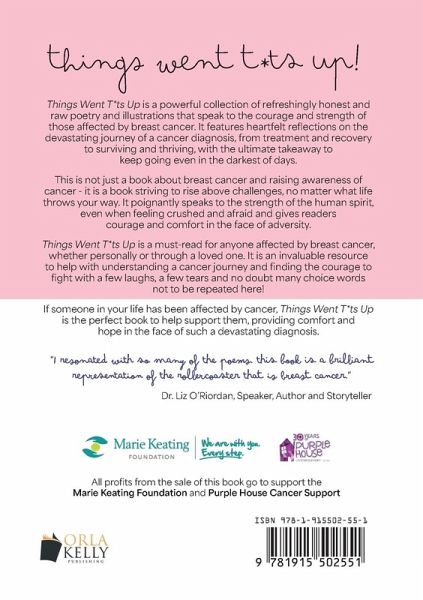 Things Went T*Ts Up is a powerful collection of refreshingly honest and raw poetry and illustrations that speak to the courage and strength of those affected by breast cancer. It features heartfelt reflections on the devastating journey of a cancer diagnosis, from treatment to recovery, with the ultimate takeaway to keep going even in the darkest of days.This is not just a book about breast cancer and raising awareness of cancer-- it is a book striving to rise above challenges, no matter what life throws your way. It is an inspiring exploration of the array of emotions encountered when facing a cancer diagnosis; from disbelief, shock, loss, self-awareness, hope, inner strength, personal transformation, healing, and ultimately surviving and thriving. It poignantly speaks to the strength of the human spirit, even when feeling crushed and afraid, and gives readers courage and comfort in the face of adversity.Things Went T*Ts Up is a must-read for anyone affected by breast cancer, whether personally or through a loved one. It is an invaluable resource to help understand a cancer journey and find the courage to fight with a few laughs, tears and no doubt many choice words not to be repeated here! If someone in your life has been affected by cancer, Things Went T*Ts Up is the perfect book to help support them, providing comfort and hope in the face of such a devastating diagnosis. Proceeds from the sale of this book go to the Marie Keating Foundation breast cancer charity, supporting those affected by cancer and their families.