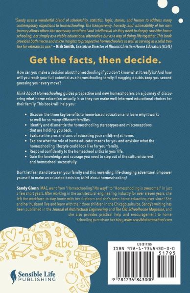 How can you make a decision about homeschooling if you don't know what it really is? And how will you reach your full potential as a homeschooling family if nagging doubts keep you second-guessing your every move? Think About Homeschooling guides prospective and new homeschoolers on a journey of discovering what home education actually is so they can make well-informed educational choices for their family. This book will help you: Discover the three key benefits to home-based education and learn why it works so well for so many different families. Identify and dismantle the homeschooling stereotypes and misconceptions that are holding you back. Evaluate the pros and cons of educating your child(ren) at home. Explore what the role of home educator means for you and envision what the homeschooling lifestyle could look like for your family. Respond confidently to the homeschool critics in your life. Gain the knowledge and courage you need to step out of the cultural current and homeschool successfully. Don't let fear stand between your family and this rewarding, life-changing adventure! Empower yourself to make an educated decision; think about homeschooling!