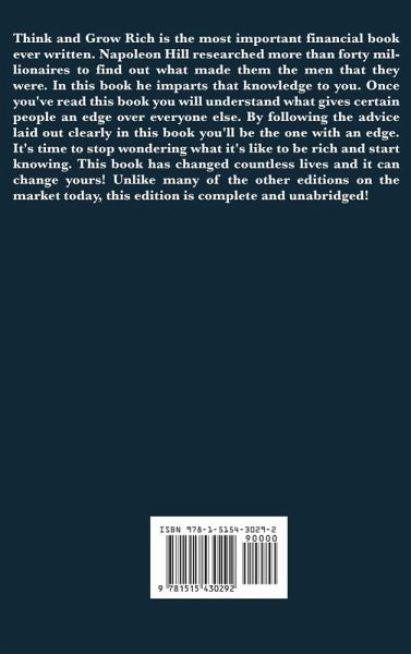 Think and grow rich is the most important financial book ever written. Napoleon Hill researched more than forty millionaires to find out what made them the men that they were. In this book he imparts that knowledge to you. Once you've read this book you will understand what gives certain people an edge over everyone else. By following the advice laid out clearly in this book you'll be the one with an edge. It's time to stop wondering what it's like to be rich and start knowing.