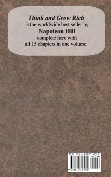Complete 1937 original edition of Think and Grow Rich by Napoleon Hill is the worldwide best seller for over 80 years focused on wealth building. In fifteen chapters, Hill describes how each of us shapes the events around us, creating much of the positive riches in our own lives. Think and Grow Rich lessons include the "Faith," "Persistence," and "Imagination." Hill teaches, for the first time, the famous Andrew Carnegie formula for money-making, based upon the proven steps to riches. Organized through 25 years of research, in collaboration with more than 500 distinguished men of great wealth, who proved by their own achievements that this philosophy is practical. No student of thought should be without this historic book. This complete version is provided in a slim volume with all 15 chapters at an affordable price. CHAPTER 1: INTRODUCTION CHAPTER 2: DESIRE CHAPTER 3: FAITH CHAPTER 4: AUTO-SUGGESTION CHAPTER 5: SPECIALIZED KNOWLEDGE CHAPTER 6: IMAGINATION CHAPTER 7: ORGANIZED PLANNING CHAPTER 8: DECISION CHAPTER 9: PERSISTENCE CHAPTER 10: POWER OF THE MASTER MIND CHAPTER 11: THE MYSTERY OF SEX TRANSMUTATION CHAPTER 12: THE SUBCONSCIOUS MIND CHAPTER 13: THE BRAIN CHAPTER 14: THE SIXTH SENSE CHAPTER 15: HOW TO OUTWIT THE SIX GHOSTS OF FEAR