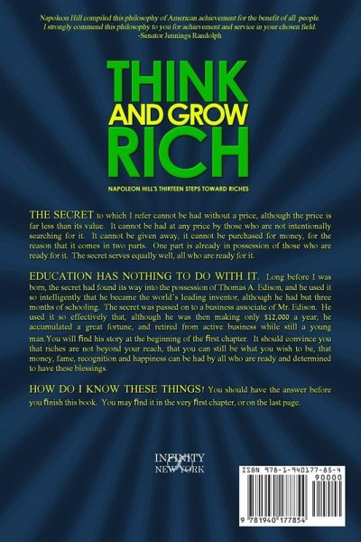 The inspiration for the bestselling self-help book, 'The Secret'. Napoleon Hill started it all. From the Author's Preface: "Long before I was born, the secret had found its way into the possession of Thomas A. Edison, and he used it so intelligently that he became the world's leading inventor, although he had but three months of schooling. The secret was passed on to a business associate of Mr. Edison. He used it so effectively that, although he was then making only $12,000 a year, he accumulated a great fortune, and retired from active business while still a young man. You will ¿nd his story at the beginning of the ¿rst chapter. It should convince you that riches are not beyond your reach, that you can still be what you wish to be, that money, fame, recognition and happiness can be had by all who are ready and determined to have these blessings. How do I know these things? You should have the answer before you ¿nish this book. You may ¿nd it in the very ¿rst chapter, or on the last page."