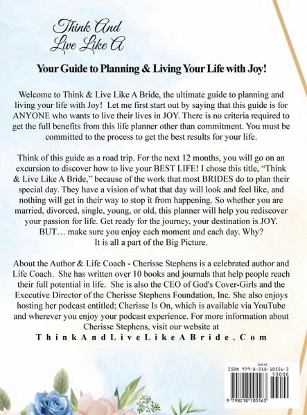 Welcome to Think And Live Like A Bride, the ultimate guide to planning and living your life with JOY! Let me first start out by saying that this guide is for ANYONE who wants to live their lives in JOY. There is no criteria required to get the full benefits from this life planner other than commitment. You must be committed to the process to get the best results for your life. Think of this guide as a road trip. For the next 12 months, you will go on an excursion to discover how to live your BEST LIFE! I chose this title, "Think And Live Like A Bride," because of the work that most BRIDES do to plan their special day. They have a vision of what that day will look and feel like, and nothing will get in their way to stop it from happening. So whether you are married, divorced, single, young or old, this LIFE PLANNER will help you rediscover your passion for life. Get ready for the journey, your destination is JOY. BUT... make sure you enjoy each moment and each day. Why? It is all a part of the Big Picture.