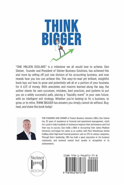"ONE MILLION DOLLARS" is a milestone we all would love to achieve. Dan Steiner, founder and President of Steiner Business Solutions, has achieved this and more by selling off just one division of his accounting business, and now reveals how you too can achieve this. This easy-to-read yet brilliant, insightful book lays out how to grow and potentially sell all or a portion of your business for A LOT of money. With anecdotes and maxims learned along the way, the author shares his own successes, mistakes, best practices, and systems to put you on a wildly successful path, placing a "liquidity event" in your own future, with an intelligent exit strategy. Whether you're looking to fix a business, to grow, or to retire, Think BIGGER has answers you simply cannot do without. Buy, read, and share this book today!
