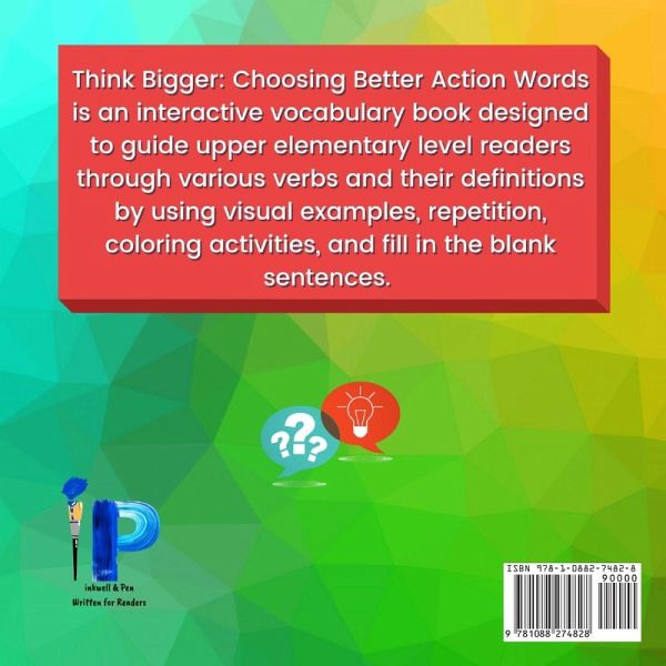 Think Bigger: Choosing Better Action Words is an interactive vocabulary book designed to guide upper elementary level readers through various verbs and their definitions by using visual examples, repetition, coloring activities, and fill in the blank sentences.
