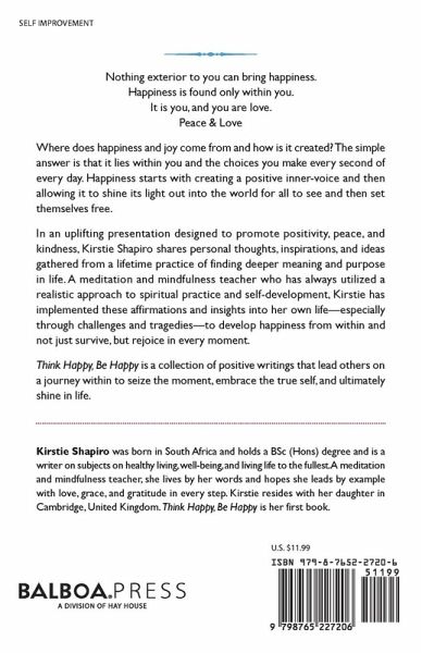 Nothing exterior to you can bring happiness. Happiness is found only within you. It is you, and you are love. Peace & Love Where does happiness and joy come from and how is it created? The simple answer is that it lies within you and the choices you make every second of every day. Happiness starts with creating a positive inner-voice and then allowing it to shine its light out into the world for all to see and then set themselves free. In an uplifting presentation designed to promote positivity, peace, and kindness, Kirstie Shapiro shares personal thoughts, inspirations, and ideas gathered from a lifetime practice of finding deeper meaning and purpose in life. A meditation and mindfulness teacher who has always utilized a realistic approach to spiritual practice and self-development, Kirstie has implemented these affirmations and insights into her own life-especially through challenges and tragedies-to develop happiness from within and not just survive, but rejoice in every moment. Think Happy, Be Happy is a collection of positive writings that lead others on a journey within to seize the moment, embrace the true self, and ultimately shine in life.