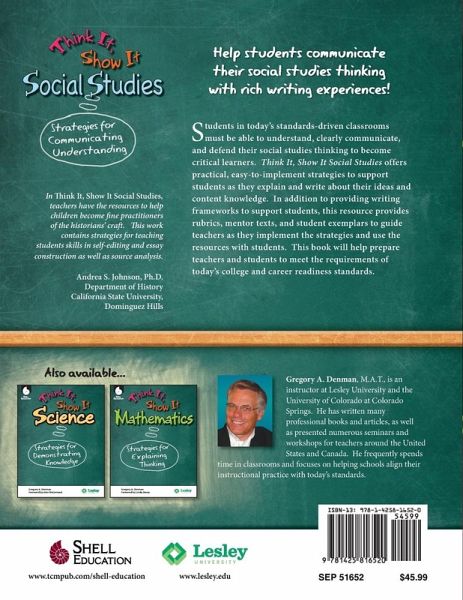 Think It, Show It: Social Studies by Gregory A. Delman is a practical and informative resource that supports the teaching of writing in the social studies classroom to meet the demands of the today's standards and the C3 Framework. The creative instructional strategies and resources guide students in communicating their historical thinking through writing and speaking. Specific step-by-step strategies are provided to help students develop clear, concise writing and discussion skills about historical documents, events, and other primary sources using text structures such as description, narrative, comparison, and cause-and-effect. The included student resources, rubrics, graphic organizers, and exemplar writing samples also support instruction and provide students a clear understanding of the expectations for success.