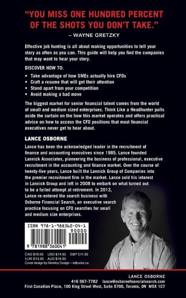 "You miss one hundred percent of the shots you don't take." -- Wayne Gretzky Effective job hunting is all about making opportunities to tell your story as often as you can. This guide will help you find the companies that may want to hear your story. DISCOVER HOW TO: Take advantage of how SMEs actually hire CFOs Craft a resume that will get their attention Stand apart from your competition Avoid making a bad move Contrary to popular belief, the biggest demand for financial executives doesn't come from the companies found in the Report on Business 1000 or Financial Post 500. The biggest market for senior financial talent comes from the world of small and medium sized enterprises. There is a healthy demand for CFOs in SMEs but this market is largely hidden from view. How smaller companies recruit for their CFOs is very different from how large companies recruit their financial talent. Lance Osborne has been recruiting financial executives for over twenty-five years and has gained unique insight into how the job market for CFOs in SMEs actually works. Think Like a Headhunter pulls aside the curtain on the how this market operates and offers practical advice on how to access the CFO positions that most financial executives never get to hear about. About the Author -- Lance Osborne Lance has been the acknowledged leader in the recruitment of finance and accounting executives since 1985. Lance founded Lannick Associates, pioneering the business of professional, executive recruitment in the accounting and finance market. Over the course of twenty-five years, Lance built the Lannick Group of Companies into the premier recruitment firm in the market. Lance sold his interest in Lannick Group and left in 2008 to embark on what turned out to be a failed attempt at retirement. In 2013, Lance re-entered the search business with Osborne Financial Search, an executive search practice focusing on CFO searches for small and medium size enterprises.