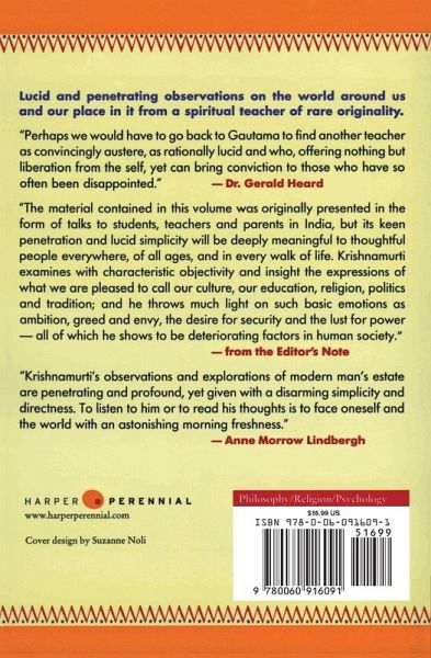 'The material contained in this volume was originally presented in the form of talks to students, teachers and parents in India, but its keen penetration and lucid simplicity will be deeply meaningful to thoughtful people everywhere, of all ages, and in every walk of life. Krishnamurti examines with characteristic objectivity and insight the expressions of what we are pleased to call our culture, our education, religion, politics and tradition; and he throws much light on such basic emotions as ambition, greed and envy, the desire for security and the lust for power ? all of which he shows to be deteriorating factors in human society.'From the Editor's Note'Krishnamurti's observations and explorations of modern man's estate are penetrating and profound, yet given with a disarming simplicity and directness. To listen to him or to read his thoughts is to face oneself and the world with an astonishing morning freshness.'Anne Marrow Lindbergh