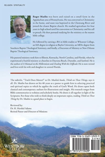 The subtitle, "Truth Does Matter!" to Dr. Maslin's book, Think on These Things, says it all. Dr. Maslin has drawn on his 40 years as a pastor to guide him in selecting practical and spiritual topics to which he applies the truth of God's Word. He draws upon both classical and contemporary authors for illustrations and insight. His research ranges from Bible commentaries to websites and scholarly books. He draws it all together in light of the Scriptures. For those who wish to think deeply on important topics, reading Think on These Things by Dr. Maslin is a good place to begin. Reviewed by: Dr. H. Hershel Adams Retired Pastor and Director of Missions