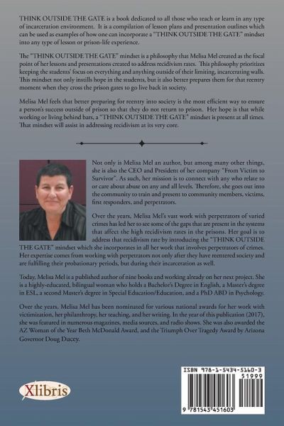 Think Outside the Gate is a book dedicated to all those who work or live in any type of incarceration environment. It contains a compilation of lesson plans and presentation outlines which can be used as an example of how one can turn any type of lesson into a "think outside the gate" experience. The "think outside the gate" mind-set is a philosophy that Melisa Mel created as the focal point of her lessons and presentations. This approach makes it a priority to keep the students' focus on everything and anything outside of their limited, incarcerating walls. This not only instills hope in them, but it also better prepares them for when they cross the prison gates to go live back in society. Melisa Mel feels that better preparing for reentry into society is the most efficient way to ensure a person's success outside of prison so that they do not return to prison. Her hope is that while working or living behind bars, a "think outside the gate" mind-set is present at all times, as that will tackle recidivism at its very core.