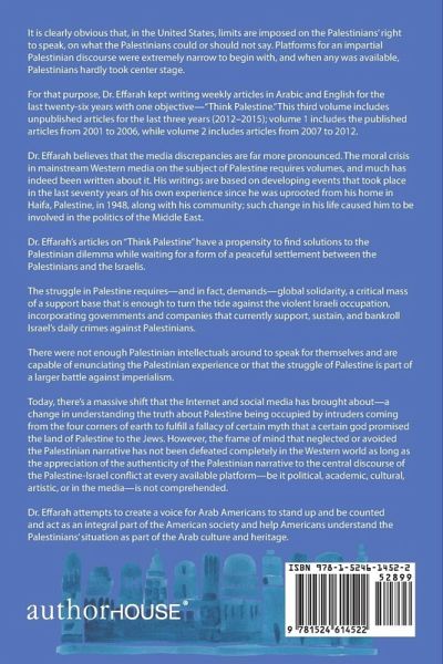 It is clearly obvious that, in the United States, limits are imposed on the Palestinians' right to speak, on what the Palestinians could or should not say. Platforms for an impartial Palestinian discourse were extremely narrow to begin with, and when any was available, Palestinians hardly took center stage. For that purpose, Dr. Effarah kept writing weekly articles in Arabic and English for the last twenty-six years with one objective-"Think Palestine." This third volume includes unpublished articles for the last three years (2012-2015); volume 1 includes the published articles from 2001 to 2006, while volume 2 includes articles from 2007 to 2012. Dr. Effarah believes that the media discrepancies are far more pronounced. The moral crisis in mainstream Western media on the subject of Palestine requires volumes, and much has indeed been written about it. His writings are based on developing events that took place in the last seventy years of his own experience since he was uprooted from his home in Haifa, Palestine, in 1948, along with his community; such change in his life caused him to be involved in the politics of the Middle East. Dr. Effarah's articles on "Think Palestine" have a propensity to find solutions to the Palestinian dilemma while waiting for a form of a peaceful settlement between the Palestinians and the Israelis. The struggle in Palestine requires-and in fact, demands-global solidarity, a critical mass of a support base that is enough to turn the tide against the violent Israeli occupation, incorporating governments and companies that currently support, sustain, and bankroll Israel's daily crimes against Palestinians. There were not enough Palestinian intellectuals around to speak for themselves and are capable of enunciating the Palestinian experience or that the struggle of Palestine is part of a larger battle against imperialism. Today, there's a massive shift that the Internet and social media has brought about-a change in understanding the truth about Palestine being occupied by intruders coming from the four corners of earth to fulfill a fallacy of certain myth that a certain god promised the land of Palestine to the Jews. However, the frame of mind that neglected or avoided the Palestinian narrative has not been defeated completely in the Western world as long as the appreciation of the authenticity of the Palestinian narrative to the central discourse of the Palestine-Israel conflict at every available platform-be it political, academic, cultural, artistic, or in the media-is not comprehended. Dr. Effarah attempts to create a voice for Arab Americans to stand up and be counted and act as an integral part of the American society and help Americans understand the Palestinians' situation as part of the Arab culture and heritage.
