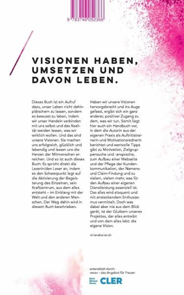 Dieses Buch ist ein Aufruf dazu, unser Leben nicht dahinplätschern zu lassen, sondern es bewusst zu leben, indem wir unser Handeln verbinden mit uns selbst und das Realität werden lassen, was wir wirklich wollen. Und das sind unsere Visionen. Sie machen uns erfolgreich, glücklich und lebendig und lassen uns die Herzen der Mitmenschen erreichen. Und so ist auch dieses Buch: Es spricht direkt die Leserin/den Leser an, indem es den Schwerpunkt legt auf die Aktivierung der Begeisterung des Einzelnen, sein Kraftzentrum, aus dem alles entsteht - im Einklang mit der Welt und den anderen Menschen. Der Weg dahin wird in diesem Buch beschrieben. Haben wir unsere Visionen hervorgebracht und ins Auge gefasst, ergibt sich ein ganz anderer, positiver Zugang zu dem, was wir tun. Somit liegt hier auch ein Handbuch vor, in dem die Autorin aus der eigenen Praxis als Auftrittstrainerin und Motivationsrednerin berichtet und wertvolle Tipps gibt zu Motivation, Zielgruppensuche und -ansprache, zum Aufbau einer Webseite und der Pflege der Kundenkommunikation, der Namens- und Claim-Findung und zu vielem, vielem mehr, was für den Aufbau einer eigenen Dienstleistung essenziell ist. Das alles wird eloquent und mit ansteckendem Enthusiasmus vermittelt. Doch was dabei aber nie aus dem Blick gerät, ist der Glutkern unseres Projektes, der alles antreibt und von dem alles lebt: die eigene Vision.