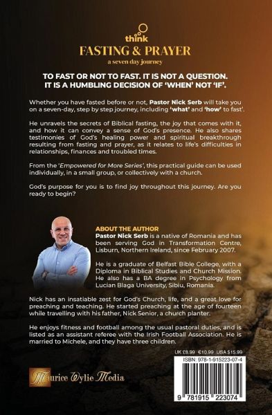 To fast or not to fast. It is not a question. It is a humbling decision of 'when' not 'if.' Whether you have fasted before or not, Pastor Nick Serb will take you on a seven-day, step by step journey, including 'what' and 'how' to fast. He unravels the secrets of Biblical fasting, the joy that comes with it, and how it can convey a sense of God's presence, He also shares testimonies of God's healing power and spiritual breakthrough resulting from fasting and prayer, as it relates to life's difficulties in relationships, finances and troubled times. From the 'Empowered for More Series,' this practical guide can be used individually, in a small group, or collectively with a church. God's purpose for you is to find joy throughout this journey. Are you ready to begin?
