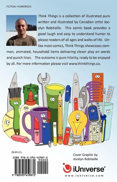 Think Things is a collection of illustrated puns written and illustrated by Canadien artist Jocelyn Robitaille. This comic book provides a good laugh and easy to understand humor to please readers of all ages and walks of life. Unlike most comics, Think Things showcases common, animated, household items delivering clever play on words and punch lines. The outcome is pure hilarity, ready to be enjoyed by all. For more information please visit www.thinkthings.ca.