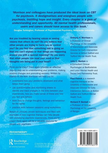 Based on clinically proven techniques andfilled with examples of how cognitive therapy can help people with distressing psychotic experiences, Think You're Crazy? Think Again will be a valuable resource for people with psychosis.
