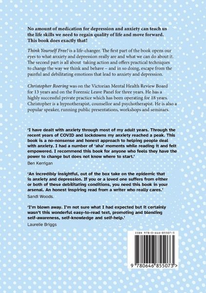 No amount of medication for depression and anxiety can teach us the life skills we need to regain quality of life and move forward. This book does exactly that! Think Yourself Free! is a life-changer. The first part of the book opens our eyes to what anxiety and depression really are and what we can do about it. The second part is all about taking action and offers practical techniques to change the way we think and behave - and in so doing, escape from the painful and debilitating emotions that lead to anxiety and depression. Christopher Roering was on the Victorian Mental Health Review Board for 13 years and on the Forensic Leave Panel for three years. He has a highly successful private practice which has been operating for 18 years. Christopher is a hypnotherapist, counsellor and psychotherapist. He is also a popular speaker, running public presentations, workshops and seminars.