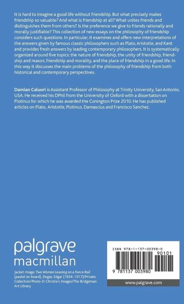 Acknowledgements Notes on Contributors Introduction; D.Caluori PART I: THE NATURE OF FRIENDSHIP Aristotle's Notion of Friendship; S.Benetatos The Character of Friendship; L.Thomas PART II: THE UNITY OF FRIENDSHIP Friendship in Kallipolis; D.Caluori Montaigne's 'Perfect' Friendship; U.Langer PART III: FRIENDSHIP AND REASON Relationships and Emotions; M.Slote Friendships: Epistemically Dangerous Liaisons?; C.Brown How to be a Non-Reductionist About Reasons of Friendship; J.Seidman PART IV: FRIENDSHIP AND MORALITY Friendship in Kant's Moral Thought; O.Sensen Consequentialism and Friendship; A.Norcross Can a Christian be a Friend? On God, Friendship and Love of Neighbour; J.Lippitt PART V: FRIENDSHIP IN A GOOD LIFE The Goods of Friendship; T.Hurka Friendship and Friends in the Stoic Theory of the Good Life; A.A.Long Aesthetics and the Art of Friendship; S.Lintott References Index