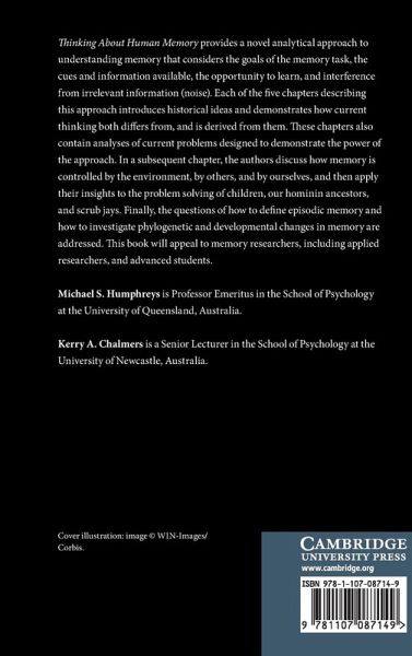 Thinking About Human Memory provides a novel analytical approach to understanding memory that considers the goals of the memory task, the cues and information available, the opportunity to learn, and interference from irrelevant information (noise). Each of the five chapters describing this approach introduces historical ideas and demonstrates how current thinking both differs from and is derived from them. These chapters also contain analyses of current problems designed to demonstrate the power of the approach. In a subsequent chapter, the authors discuss how memory is controlled by the environment, by others, and by ourselves, and then apply their insights to the problem solving of children, our hominin ancestors, and scrub jays. Finally, the questions of how to define episodic memory and how to investigate phylogenetic and developmental changes in memory are addressed. This book will appeal to memory researchers, including applied researchers, and advanced students.