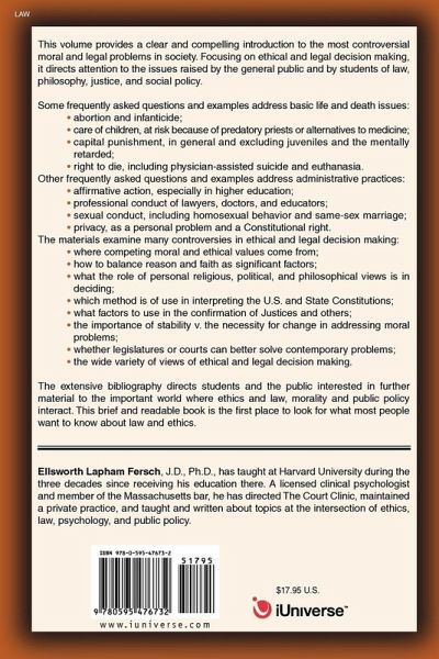 This volume provides a clear and compelling introduction to the most controversial moral and legal problems in society. Focusing on ethical and legal decision making, it directs attention to the issues raised by the general public and by students of law, philosophy, justice, and social policy. Some frequently asked questions and examples address basic life and death issues: abortion and infanticide; care of children, at risk because of predatory priests or alternatives to medicine; capital punishment, in general and excluding juveniles and the mentally retarded; right to die, including physician-assisted suicide and euthanasia. Other frequently asked questions and examples address administrative practices: affirmative action, especially in higher education; professional conduct of lawyers, doctors, and educators; sexual conduct, including homosexual behavior and same-sex marriage; privacy, as a personal problem and a Constitutional right. The materials examine many controversies in ethical and legal decision making: where competing moral and ethical values come from; how to balance reason and faith as significant factors; what the role of personal religious, political, and philosophical views is in deciding; which method is of use in interpreting the U.S. and State Constitutions; what factors to use in the confirmation of Justices and others; the importance of stability v. the necessity for change in addressing moral problems; whether legislatures or courts can better solve contemporary problems; the wide variety of views of ethical and legal decision making. The extensive bibliography directs students and the public interested in further material to the important world where ethics and law, morality and public policy interact. This brief and readable book is the first place to look for what most people want to know about law and ethics.