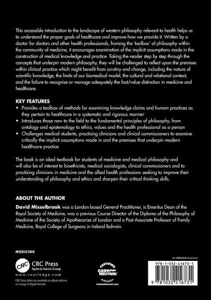 Taking the reader step by step through the concepts that underpin modern philosophy, they will be challenged to reflect upon the premises within clinical practice which might benefit from scrutiny and challenge, including the nature of scientific knowledge, the limits of our biomedical model, the cultural and relational context, and the failure to recognise or manage adequately the fact/value distinction in medicine and healthcare.