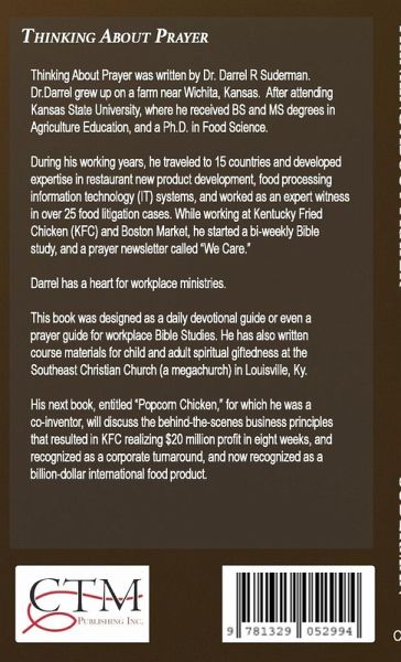 Dr. Darrel R. Suderman grew up on a farm near Wichita, Kansas. He attended Kansas State University where he received BS and MS degrees in Agriculture Education, and a Ph.D. in Food Science. During his working years, he traveled to 15 countries and developed expertise in restaurant new product development, food processing information technology (IT) systems, and worked as an expert witness in over 25 food litigation cases. While working at Kentucky Fried Chicken (KFC) and Boston Market he started a bi-weekly Bible study, and a prayer newsletter called "We Care." Darrel has a heart for workplace ministries. This book was designed as a daily devotional guide or a prayer guide for workplace Bible studies. He also wrote the course materials for child and adult spiritual giftedness at Southeast Christian megachurch in Louisville, Ky. His next book, entitled "Popcorn Chicken," for which he was a co-inventor, will discuss the behind-the-scenes business principles that resulted in KFC realizing $20 million profit in eight weeks, recognized as a corporate turnaround. and now recognized as a billion-dollar international food product.