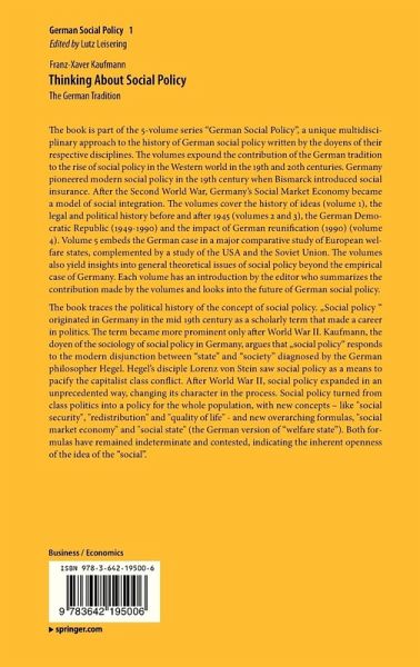 The book traces the political history of the concept of social policy. "Social policy" originated in Germany in the mid 19th century as a scholarly term that made a career in politics. The term became more prominent only after World War II. Kaufmann, the doyen of the sociology of social policy in Germany, argues that "social policy" responds to the modern disjunction between "state" and "society" diagnosed by the German philosopher Hegel. Hegel's disciple Lorenz von Stein saw social policy as a means to pacify the capitalist class conflict. After World War II, social policy expanded in an unprecedented way, changing its character in the process. Social policy turned from class politics into a policy for the whole population, with new concepts - like "social security", "redistribution" and "quality of life" - and new overarching formulas, "social market economy" and "social state" (the German version of "welfare state"). Both formulas have remained indeterminate and contested, indicating the inherent openness of the idea of the "social".