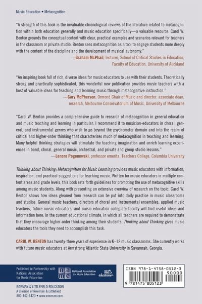 Thinking about Thinking: Metacognition for Music Learning providesmusic educators with information, inspiration, and practical suggestions for teaching music. Written for music educators in multiple content areas and grade levels, the book sets forth guidelines for promoting the use of metacognitive skills among music students