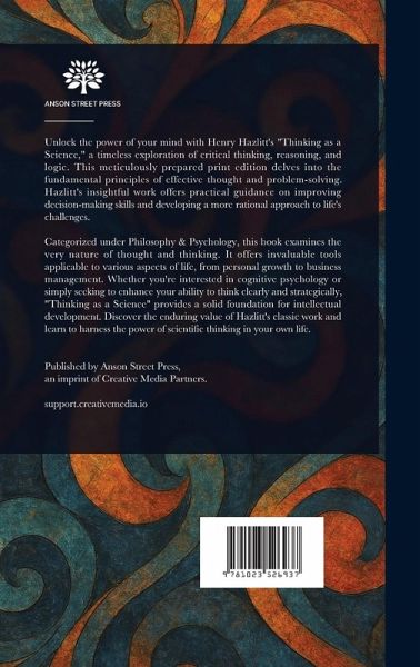 Unlock the power of your mind with Henry Hazlitt's "Thinking as a Science," a timeless exploration of critical thinking, reasoning, and logic. This meticulously prepared print edition delves into the fundamental principles of effective thought and problem-solving. Hazlitt's insightful work offers practical guidance on improving decision-making skills and developing a more rational approach to life's challenges. Categorized under Philosophy & Psychology, this book examines the very nature of thought and thinking. It offers invaluable tools applicable to various aspects of life, from personal growth to business management. Whether you're interested in cognitive psychology or simply seeking to enhance your ability to think clearly and strategically, "Thinking as a Science" provides a solid foundation for intellectual development. Discover the enduring value of Hazlitt's classic work and learn to harness the power of scientific thinking in your own life. This work has been selected by scholars as being culturally important, and is part of the knowledge base of civilization as we know it. This work is in the public domain in the United States of America, and possibly other nations. Within the United States, you may freely copy and distribute this work, as no entity (individual or corporate) has a copyright on the body of the work. Scholars believe, and we concur, that this work is important enough to be preserved, reproduced, and made generally available to the public. We appreciate your support of the preservation process, and thank you for being an important part of keeping this knowledge alive and relevant.