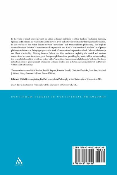 In the wake of much previous work on Gilles Deleuze's relations to other thinkers (including Bergson, Spinoza and Leibniz), his relation to Kant is now of great and active interest and a thriving area of research. In the context of the wider debate between 'naturalism' and 'transcendental philosophy', the implicit dispute between Deleuze's 'transcendental empiricism' and Kant's 'transcendental idealism' is of prime philosophical concern. Bringing together the work of international experts from both Deleuze scholarship and Kant scholarship, Thinking Between Deleuze and Kant addresses explicitly the varied and various connections between these two great European philosophers, providing key material for understanding the central philosophical problems in the wider 'naturalism/ transcendental philosophy' debate. The book reflects an area of great current interest in Deleuze Studies and initiates an ongoing interest in Deleuze within Kant scholarship. The contributors are Mick Bowles, Levi R. Bryant, Patricia Farrell, Christian Kerslake, Matt Lee, Michael J. Olson, Henry Somers-Hall and Edward Willatt.