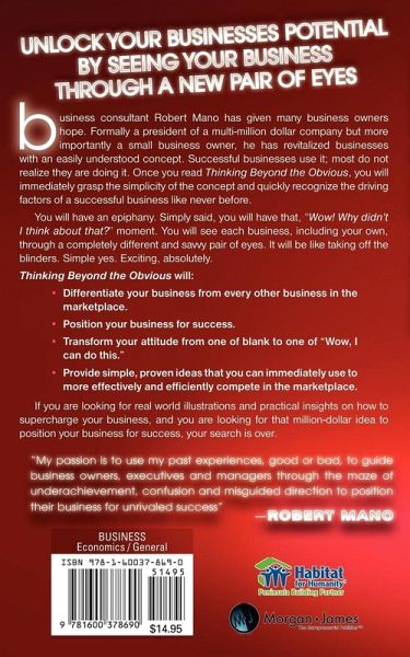 Business consultant Robert Mano has given many business owners hope. Formally a president of a multi-million dollar company but more importantly a small business owner, he has revitalized businesses with an easily understood concept. Successful businesses use it; most do not realize they are doing it. Once you read "Thinking Beyond The Obvious," you will immediately grasp the simplicity of the concept and quickly recognize the driving factors of a successful business like never before. You will have an epiphany. Simply said, you will have that, "wow!" "why didn't I think about that?" moment. You will see each business, including your own, through a completely different and savvy pair of eyes. It will be like taking off the blinders. Simple yes. Exciting, absolutely.