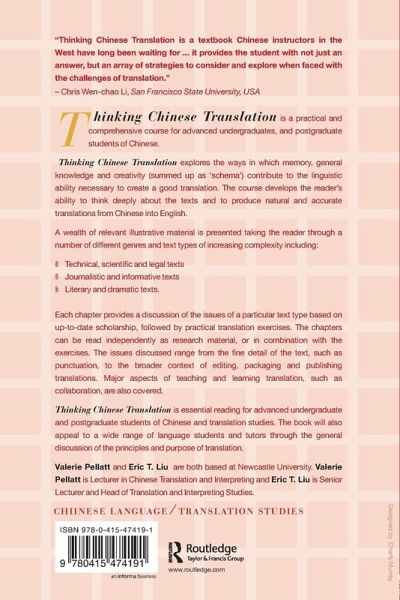 Suitable for advanced undergraduates and postgraduate students of Chinese. "Thinking Chinese Translation", this book explores the ways in which memory, general knowledge, and creativity (summed up as 'schema') contribute to the linguistic ability necessary to create a good translation.