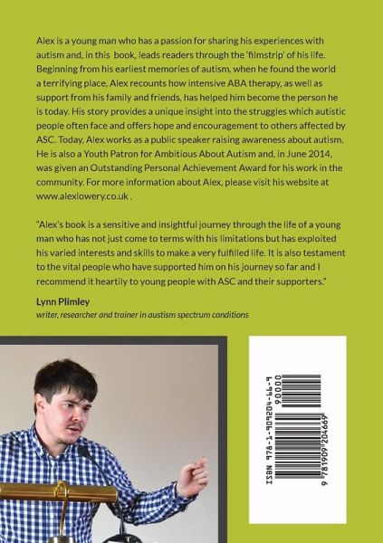 'Alex's book outlines his detailed recollections of his life so far from his earliest memories at the age of 3 right up to the age of 19. His memories are acute and he can give virtual word for word, action by action descriptions of the whole of his life. This, he explains in the book, is one of his special skills that adds meaning to events that have happened every day as he enjoys retreating to a quiet place to run through the day in film-like sequences. What makes his story come alive is his analysis of what he was feeling and how others around him have responded. This is a heightened level of awareness of self and others that is supposed to be missing in the autism spectrum but Alex uses his sensitivity to share some poignant moments as well as sources of humour. Lynn Plimley, writer, researcher and trainer in ASC