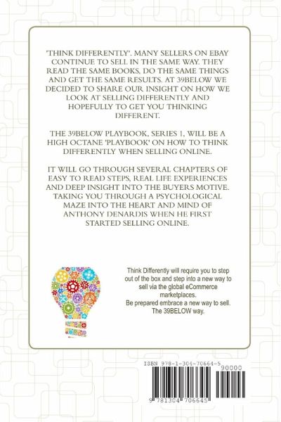 'THINK DIFFERENTLY'. MANY SELLERS ON eBay CONTINUE TO SELL IN THE SAME WAY. THEY READ THE SAME BOOKS, DO THE SAME THINGS AND GET THE SAME RESULTS. AT 39BELOW WE DECIDED TO SHARE OUR INSIGHT ON HOW WE LOOK AT SELLING DIFFERENTLY AND HOPEFULLY TO GET YOU THINKING DIFFERENT. THE 39BELOW PLAYBOOK, SERIES 1, WILL BE A HIGH OCTANE 'PLAYBOOK' ON HOW TO THINK DIFFERENTLY WHEN SELLING ONLINE. IT WILL GO THROUGH SEVERAL CHAPTERS OF EASY TO READ STEPS, REAL LIFE EXPERIENCES AND DEEP INSIGHT INTO THE BUYERS MOTIVE. TAKING YOU THROUGH A PSYCHOLOGICAL MAZE INTO THE HEART AND MIND OF ANTHONY DENARDIS WHEN HE FIRST STARTED SELLING ONLINE.