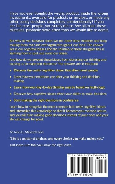 Have you ever bought the wrong product, made the wrong investments, overpaid for products or services, or made any other costly decisions completely unintentionally? If you are like most people, you surely did so. We all make these mistakes, probably more often than we would like to admit. But why do we, however smart we are, make these mistakes and keep making them over and over again throughout our lives? The answer lies in our cognitive biases and the solution to these struggles lies in learning how to spot and avoid our biases. And how do we prevent these biases from distorting our thinking and causing us to make bad decisions? The answers are in this book. This book helps you: ¿ Discover the costly cognitive biases that affect most people. ¿ Learn how your emotions can alter your thinking and decision making. ¿ Learn how your day-to-day thinking may be based on faulty logic. ¿ Discover how cognitive biases affect your ability to make decisions. ¿ Start making the right decisions in confidence. Learn how to recognize the most common but costly cognitive biases and internalize this knowledge so that it becomes your second nature, and you will start making good decisions instead of poor ones and your life will change for good. As John C. Maxwell said: "Life is a matter of choices, and every choice you make makes you." Just make sure that you make the right ones.