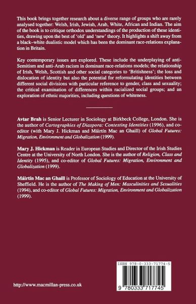 Introduction ; M.J. Hickman , M.Mac an Ghaill & A.Brah PART 1: MANAGING DIFFERENCE WITHIN THE NATION Jews, Arabs and The Theorisation of Racism in Britain and France; M.Silverman & N.Yuval-Davis Bringing The 'Local' Back In: The Production of Welsh Identities; A.Thompson , G.Day & D.Adamson PART 2: REPRESENTING WHITENESS Performing Whiteness: Skinhead Culture and The Defence of White Masculinities; A.Kayak Populist Configurations of Race and Gender: The Case of Hugh Grant, Liz Hurley and Divine Brown; S.Neal Whiter Shades of Pale: Media-Hybridities of Rodney King; J.Van Loon PART 3: COMPLEX SOCIAL DIVISIONS AND CULTURAL INTERACTIONS Gender, Ethnicity and Politics: the Protestants of Northern Ireland; R.Sales The African-Indian Antithesis? The 1949 Durban 'Riots' in South Africa; R.Thiara PART 4: MIGRATION AND IDENTITY Migration and Dislocation: Jewish Women's Experience; R.Swirsky Globalisation, Western Culture and Riverdance ; J.Sherlock Index