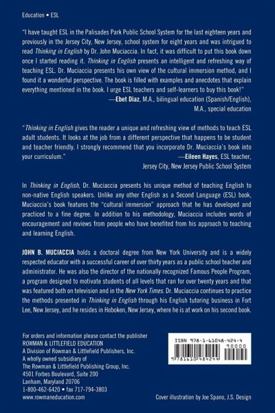 Thinking in English represents Dr. Muciaccia's unique method of teaching English to non-native English speakers. Unlike any other English as a Second Language (ESL) book, Muciaccia's book features the "cultural immersion" approach that he has developed and practiced to a fine degree. In addition to his methodology, Muciaccia includes words of encouragement and reviews from people who have benefited from his approach to teaching and learning English.