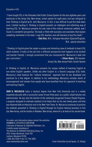 Thinking in English represents Dr. Muciaccia's unique method of teaching English to non-native English speakers. Unlike any other English as a Second Language (ESL) book, Muciaccia's book features the "cultural immersion" approach that he has developed and practiced to a fine degree. In addition to his methodology, Muciaccia includes words of encouragement and reviews from people who have benefited from his approach to teaching and learning English.