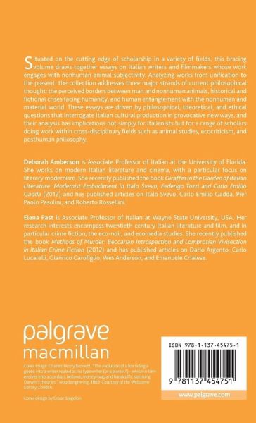 Preface: Mimesis: The Heterospecific as Ontopoetic Epiphany; Roberto Marchesini Introduction: Thinking Italian Animals; Deborah Amberson and Elena Past PART I: ONTOLOGIES AND THRESHOLDS 1. Confronting the Specter of Animality: Tozzi and the Uncanny Animal of Modernism; Deborah Amberson 2. Cesare Pavese, Posthumanism, and the Maternal Symbolic; Elizabeth Leake 3. Montale's Animals: Rhetorical Props or Metaphysical Kin?; Gregory Pell 4. The Word Made Animal Flesh: Tommaso Landolfi's Bestiary; Simone Castaldi 5. Animal Metaphors, Biopolitics, and the Animal Question: Mario Luzi, Giorgio Agamben, and the Human-Animal Divide; Matteo Gilebbi PART II: BIOPOLITICS AND HISTORICAL CRISIS 6. Creatureliness and Posthumanism in Liliana Cavani's The Night Porter and Pier Paolo Pasolini's Salò; Alexandra Hills 7. Elsa Morante at the Biopolitical Turn: Becoming-Woman, Becoming-Animal, Becoming-Imperceptible; Giuseppina Mecchia 8. Foreshadowing the Posthuman: Hybridization, Apocalypse, and Renewal in Paolo Volponi; Daniele Fioretti 9. The Post-Apocalyptic Cookbook: Animality, Posthumanism, and Meat in Laura Pugno and Wu Ming; Valentina Fulginiti PART III: ECOLOGIES AND HYBRIDIZATIONS 10. The Monstrous Meal: Flesh Consumption and Resistance in the European Gothic; David Del Principe 11. Contemporaneità and Ecological Thinking in Carlo Levi's Writing; Giovanna Faleschini Lerner 12. Hybriditales: Posthumanizing Calvino; Serenella Iovino 13. (Re)membering Kinship: Living with Goats in The Wind Blows Round and Le quattro volte; Elena Past