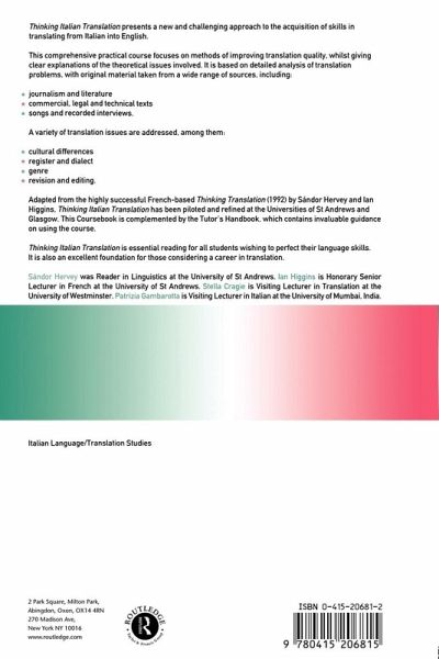 Thinking Italian Translation is a comprehensive and practical translation course. It focuses on improving translation quality and gives clear definitions of translation theories. Texts are taken from sources including journalism, technical texts and screenplays. Translation issues addressed include cultural differences, genre, and revision and editing. Adapted from the successful French-based Thinking Translation (1992), the course has been piloted and refined at the Universities of St Andrews and Glasgow. A Tutor's Handbook offering invaluable guidance on using the course is available for free download at http://www.routledge.com/cw/thinkingtranslation