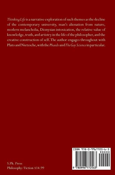 Thinking Life is a narrative exploration of such themes as the decline of the contemporary university, man's alienation from nature, modern melancholia, Dionysian intoxication, the relative value of knowledge, truth, and artistry in the life of the philosopher, and the creative construction of self. The author engages throughout with Plato and Nietzsche, with the Phaedo and The Gay Science in particular.
