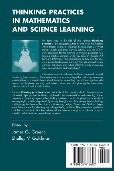 The term used in the title of this volume--thinking practices--evokes questions that the authors of the chapters within it begin to answer: What are thinking practices? What would schools and other learning settings look like if they were organized for the learning of thinking practices? Are thinking practices general, or do they differ by disciplines? If there are differences, what implications do those differences have for how we organize teaching and learning? How do perspectives on learning, cognition, and culture affect the kinds of learning experiences children and adults have? This volume describes advances that have been made toward answering these questions. These advances involve several agendas, including increasing interdisciplinary communication and collaboration; reconciling research on cognition with research on teaching, learning, and school culture; and strengthening the connections between research and school practice. The term thinking practices is symbolic of a combination of theoretical perspectives that have contributed to the volume editors' understanding of how people learn, how they organize their thinking inside and across disciplines, and how school learning might be better organized. By touring through some of the perspectives on thinking and learning that have evolved into school learning designs, Greeno and Goldman begin to establish a frame for what they are calling thinking practices. This volume is a significant contribution to a topic that they believe will continue to emerge as a coherent body of scientific and educational research and practice.