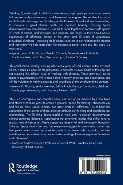 Series Editor's Preface Foreword Introduction Thinking space: the model Race and our evasions of invitations to think: how identifications and idealizations may prevent us from thinking Between fear and blindness: the white therapist and the black patient Is it coz I'm white? Being "black" in the transference: working under the spectre of racism The complexity of cultural competence "Class is in you": an exploration of some social class issues in psychotherapeutic work Psychoanalysis and homosexuality: keeping the discussion moving Paradoxes and blind spots: an exploration of Irish identity in British organizations and society Dehumanization, guilt, and large group dynamics with reference to the West, Israel, and the Palestinians The August 2011 Riots them and us Thinking Space events 2002 2013