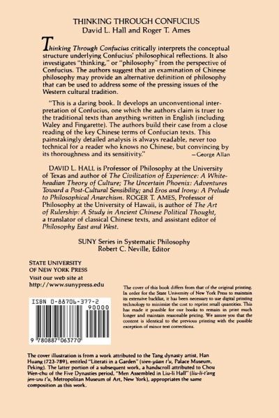 Thinking Through Confucius critically interprets the conceptual structure underlying Confucius' philosophical reflections. It also investigates "thinking," or "philosophy" from the perspective of Confucius. Perhaps the philosophical question of our time is "what is philosophy". The authors suggest that an examination of the Chinese philosophy may provide an alternative definition of philosophy that can be used to address some of the pressing issues of the Western cultural tradition. This book finds an appropriate language for the interpretation of traditional Chinese philosophical thought - a language which is relatively free from the bias and presuppositions of Western philosophy.