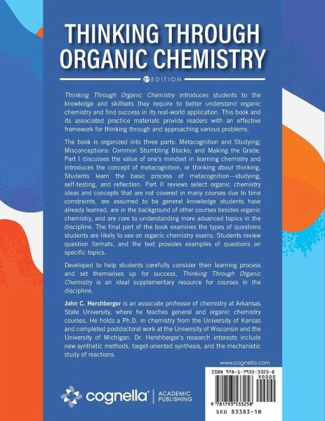 "Thinking through Organic Chemistry introduces students to the knowledge and skillsets they require to better understand organic chemistry and find success in its real-world application. This book and its associated practice materials provide readers with an effective framework for thinking through and approaching various problems. The book is organized into three parts: Metacognition and Studying; Misconceptions: Common Stumbling Blocks; and Making the Grade. Part I discusses the value of one's mindset in learning chemistry and introduces the concept of metacognition, or thinking about thinking. Students learn the basic process of metacognition--studying, self-testing, and reflection. Part II reviews select organic chemistry ideas and concepts that are not covered in many courses due to time constraints, are assumed to be general knowledge students have already learned, are in the background of other courses besides organic chemistry, and are core to understanding more advanced topics in the discipline. The final part of the book examines the types of questions students are likely to see on organic chemistry exams. Students review question formats, and the text provides examples of questions on specific topics. Developed to help students carefully consider their learning process and set themselves up for success, Thinking Through Organic Chemistry is an ideal supplementary resource for courses in the discipline."