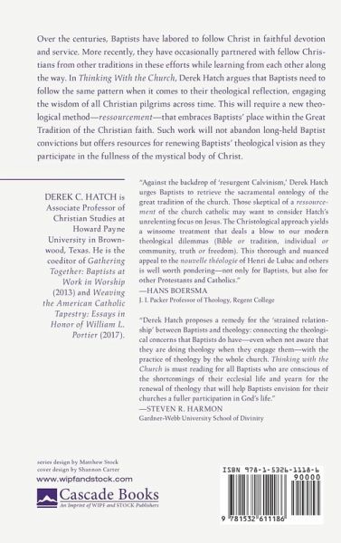 Over the centuries, Baptists have labored to follow Christ in faithful devotion and service. More recently, they have occasionally partnered with fellow Christians from other traditions in these efforts while learning from each other along the way. In Thinking With the Church, Derek Hatch argues that Baptists need to follow the same pattern when it comes to their theological reflection, engaging the wisdom of all Christian pilgrims across time. This will require a new theological method--ressourcement--that embraces Baptists' place within the Great Tradition of the Christian faith. Such work will not abandon long-held Baptist convictions but offers resources for renewing Baptists' theological vision as they participate in the fullness of the mystical body of Christ.